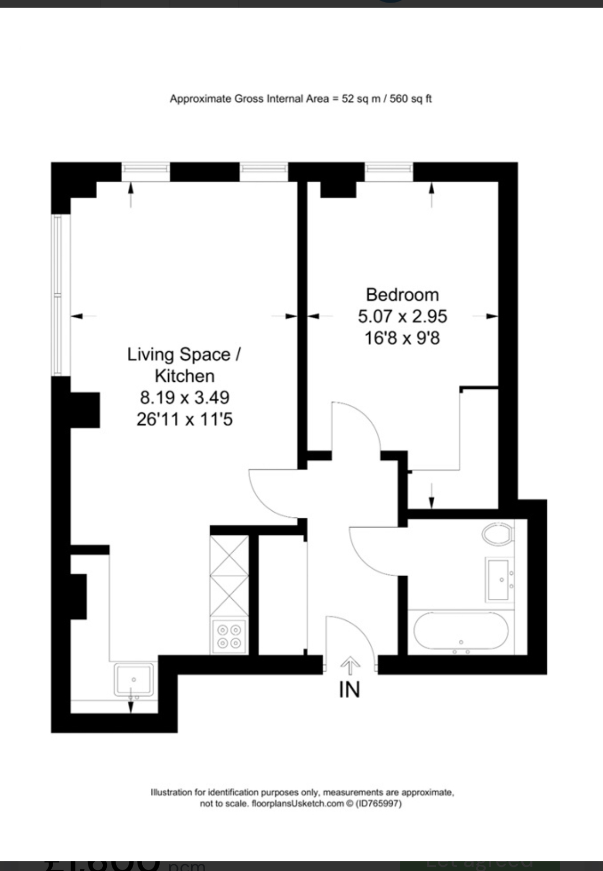 The apartment comprises a bright reception area with a fully fitted contemporary kitchen featuring integrated appliances, generous floor-to-ceiling windows allowing excellent natural light, a spacious double bedroom with built-in storage, and a sleek modern bathroom finished to a high standard.